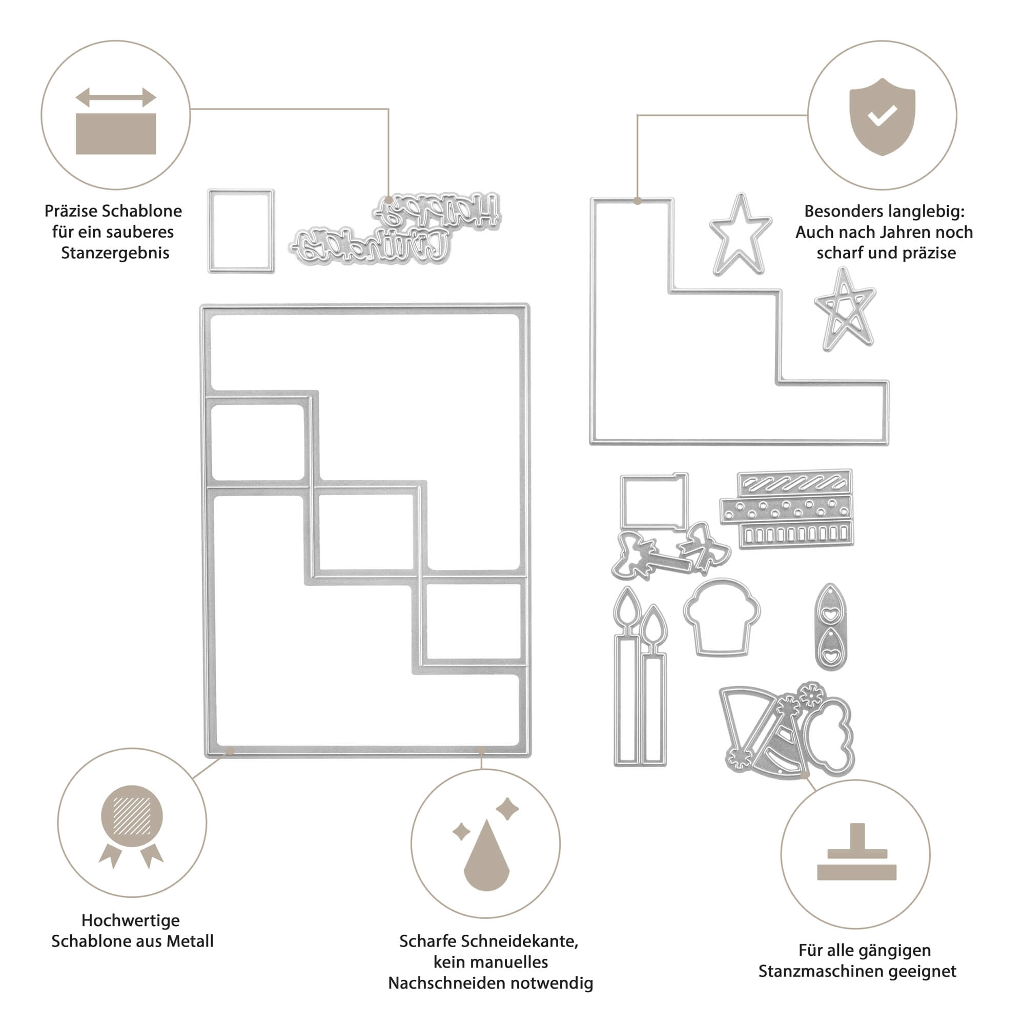 Alle abgebildeten Stanzen sind enthalten. Zubehör wie Papier oder Maschinen ist nicht Teil des Lieferumfangs