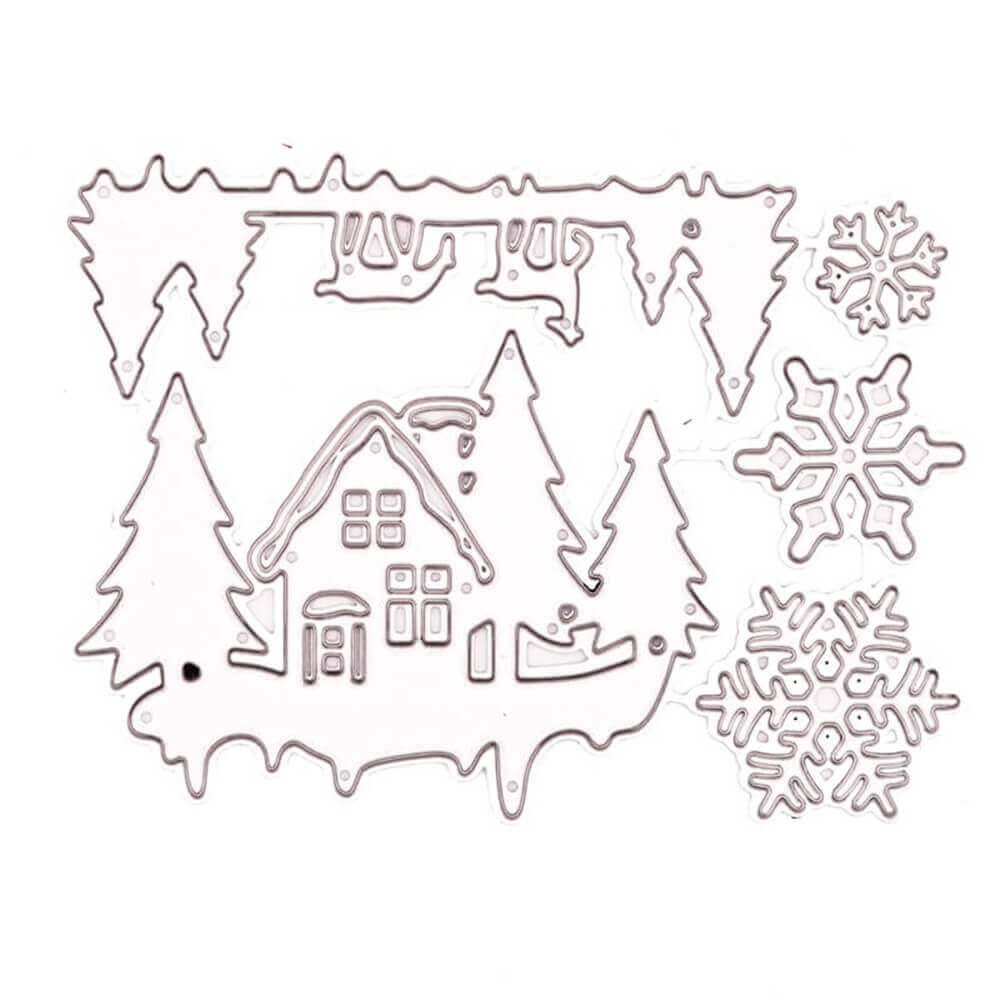 Haus mit Tannen im Schnee mit drei Schneeflocken und Reihe mit Rehen und Tannen, Gesamte Stanze ca. 9 x 7 cm, Haus ca. 6,5 x 5 cm, Rehreihe ca. 8 x 2 cm, Schneeflocken ca. 2,5 x 2,5; 2 x 2 und 1 x 1 cm groß.