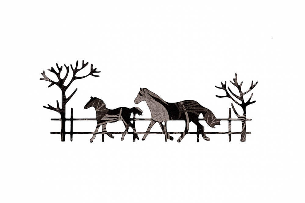 Landschaft mit einem Zaun, zwei Pferden und zwei Bäumen, Größe ca. 14 x 5,1 cm .