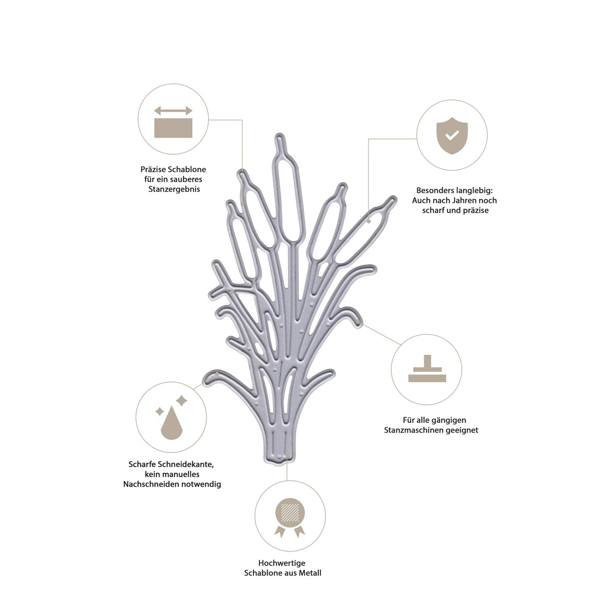 Unsere Stanzschablonen sind grundsätzlich mit allen Stanzmaschinen kompatibel, wenn sie hineinpassen. Für die Stanzschablone Natur Schilf gilt: