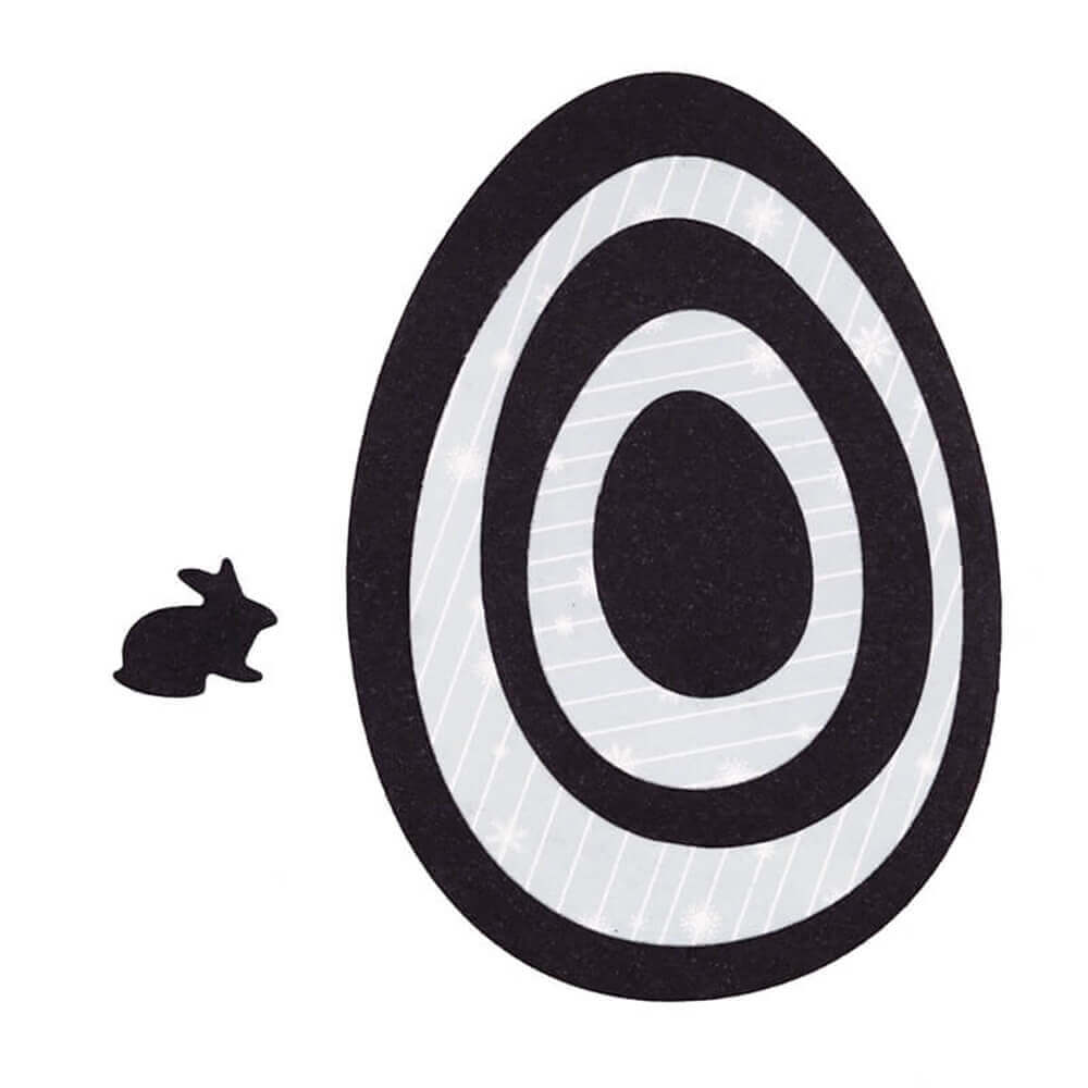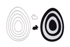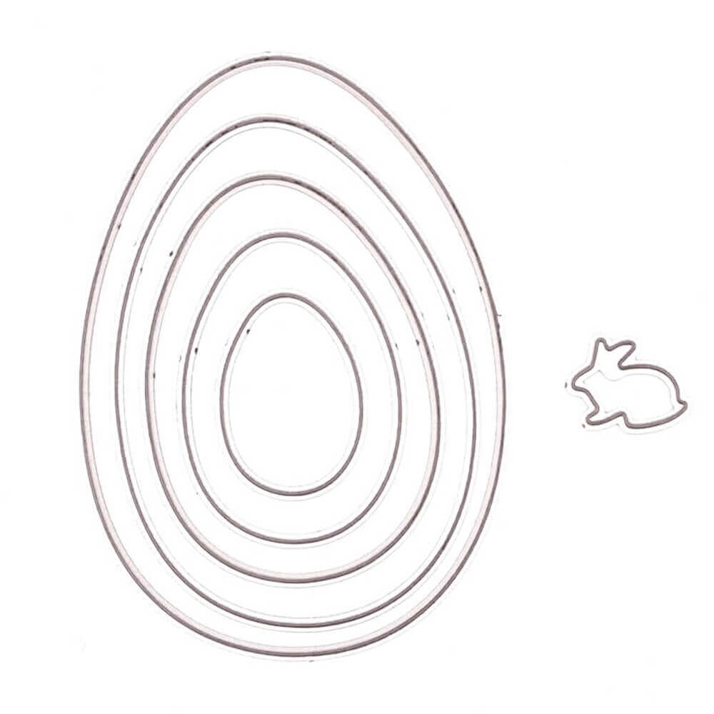 Fünf verschieden große Ostereier mit kleinem Hasen, Gesamte Stanze ca. 7,5 x 10 cm, größtes Ei 7,5 x 10 cm, kleinstes Ei ca. 2,5 x 3,5 cm. Hase ca. 2 x 2 cm groß.