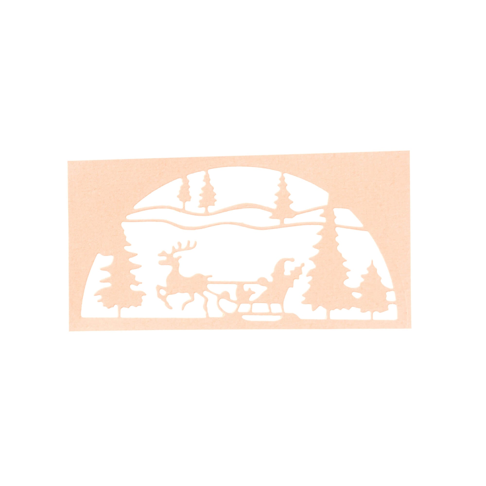 Schlitten mit Rentier und Tannenbäumen in Halbkreis Form, Gesamte Stanze ca. 11 x 5,5 cm groß.