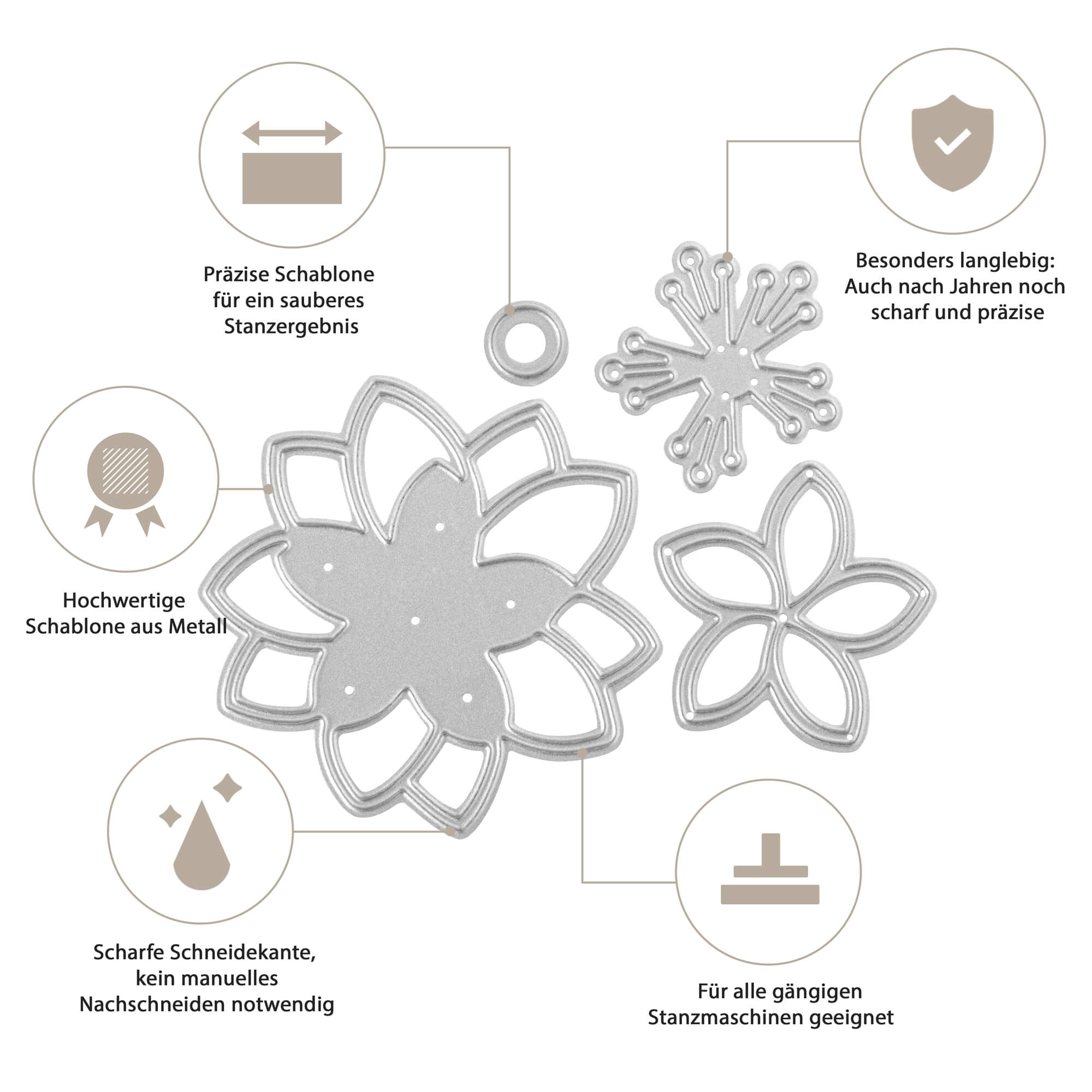Unsere Stanzen bestehen aus hochwertigem, langlebigem Stahl und sind für den langfristigen Einsatz konzipiert – bei richtiger Anwendung kannst du sie über viele Jahre verwenden.