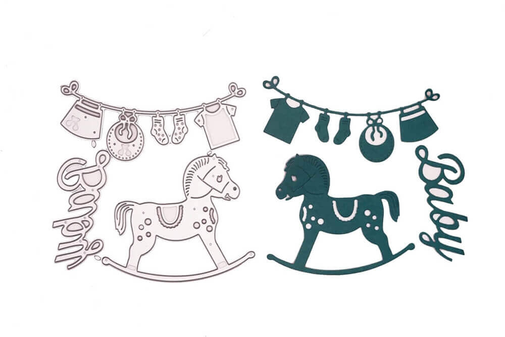 Set aus Schaukelpferd, Wäscheleine mit Babykleidung und "Baby"-Schriftzug, Pferd: 7,5 x 8,5 cm, Kette: 10 x 3,5 cm, Schriftzug: 7 x 3 cm.
